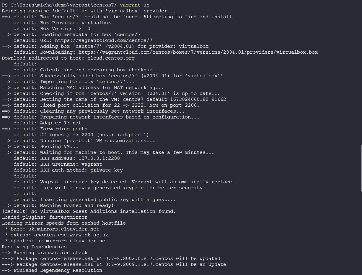 Nếu điều hướng đến thư mục này, bạn có thể sử dụng vagrant up để khởi động máy centos7 trong môi trường của bạn.