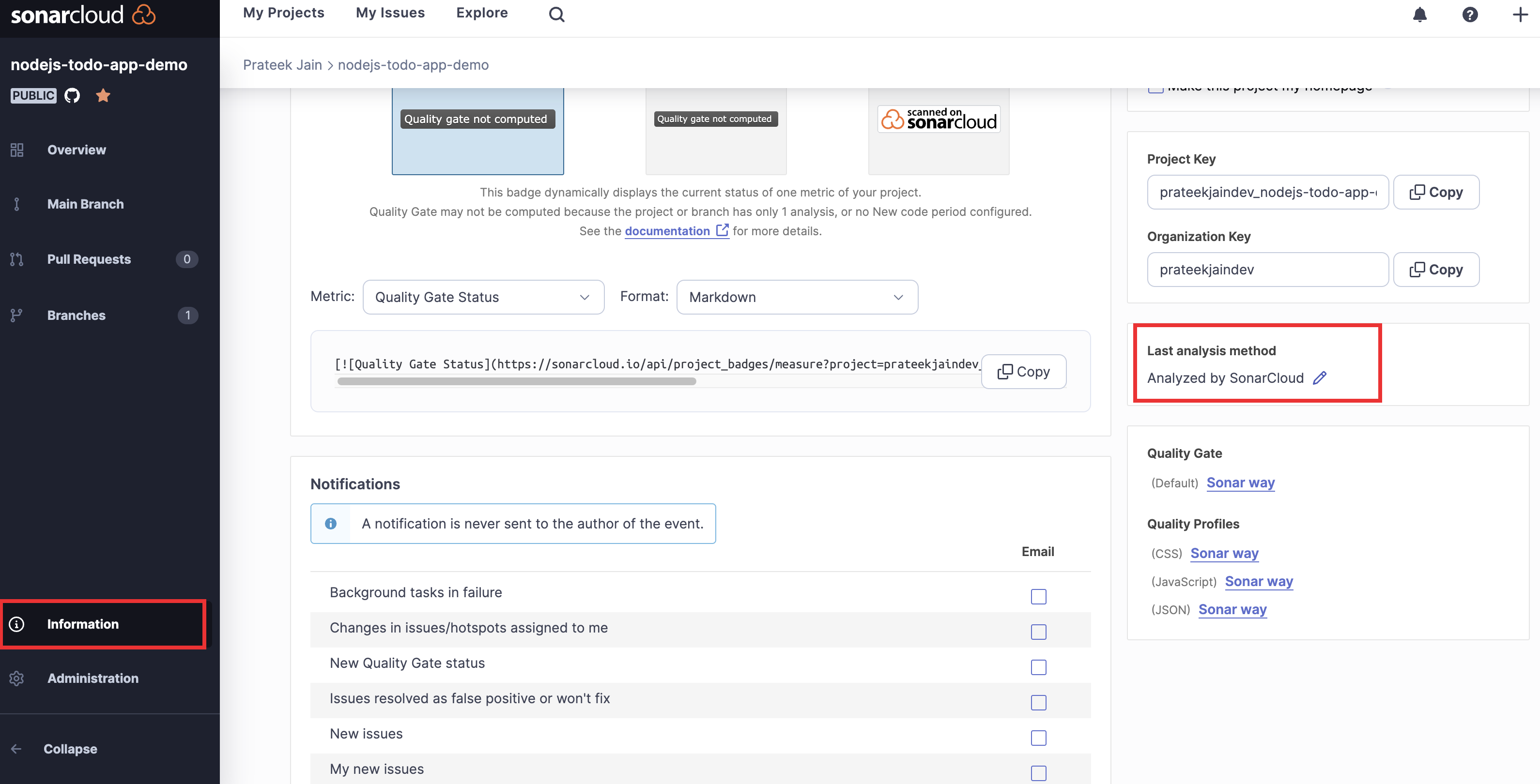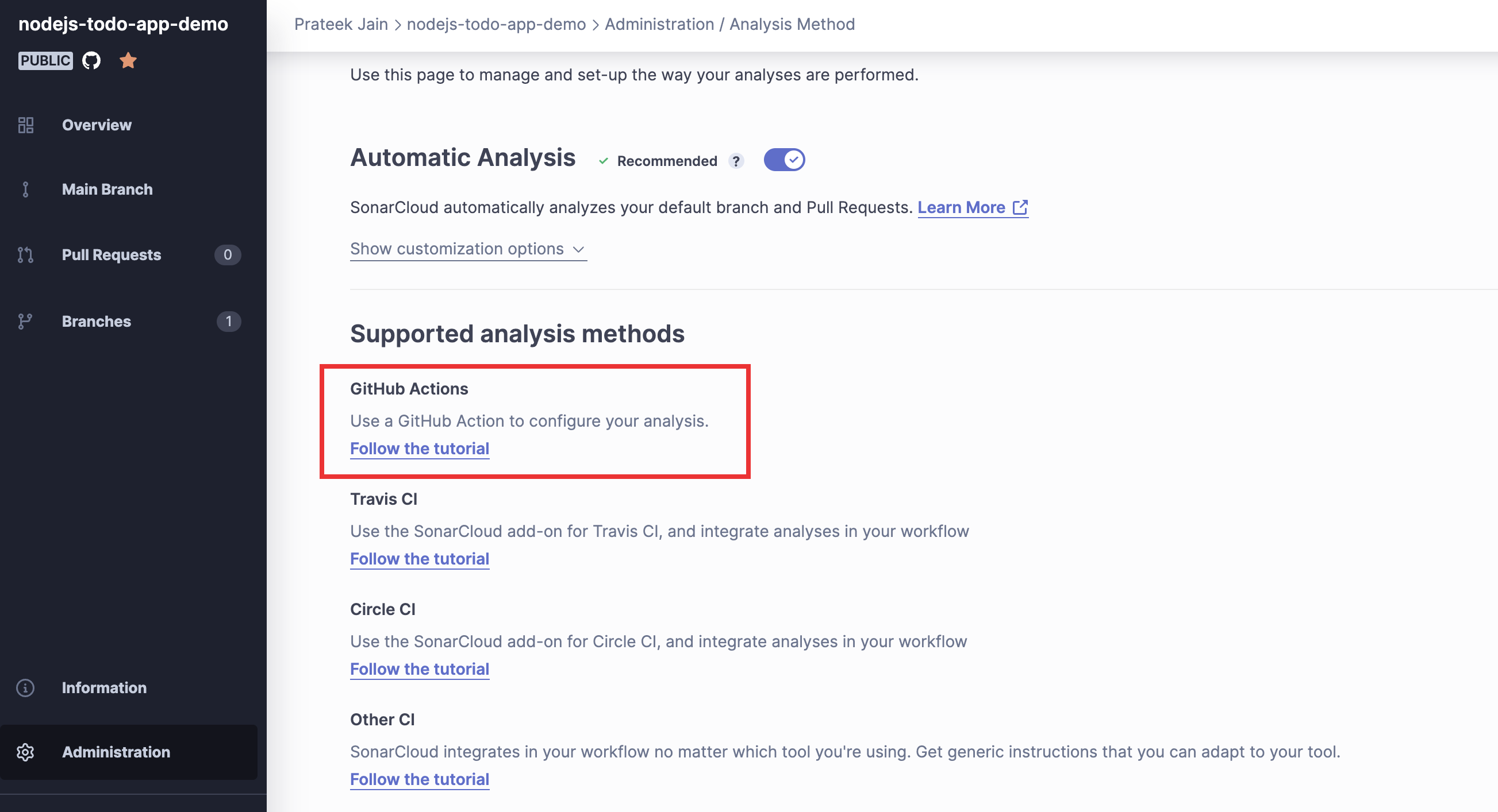 - Để thiết lập GitHub Actions, nhấp vào dự án, sau đó vào Information > Last analysis method