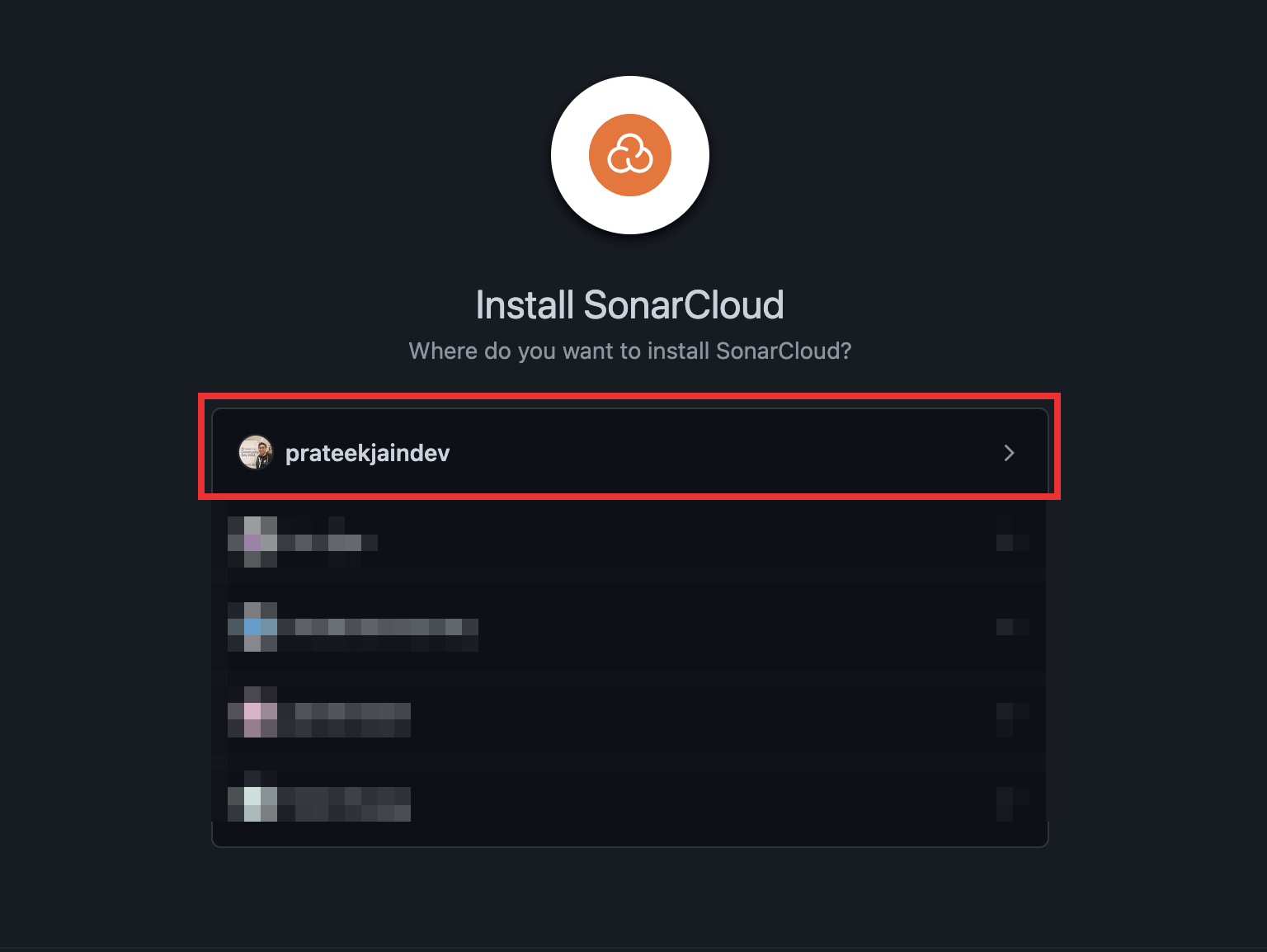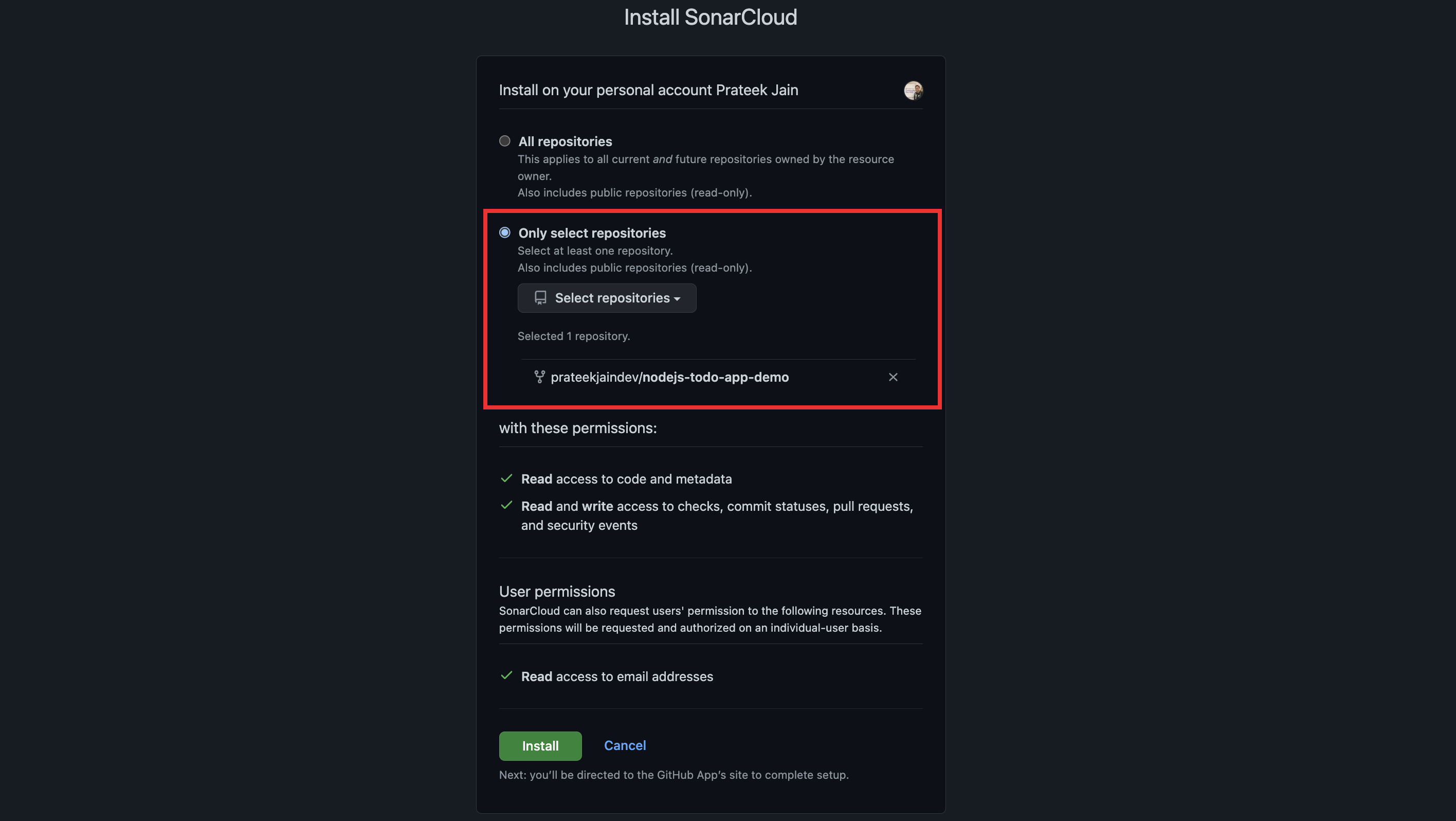- Ủy quyền và cài đặt ứng dụng SonarCloud để truy cập tài khoản GitHub của bạn.