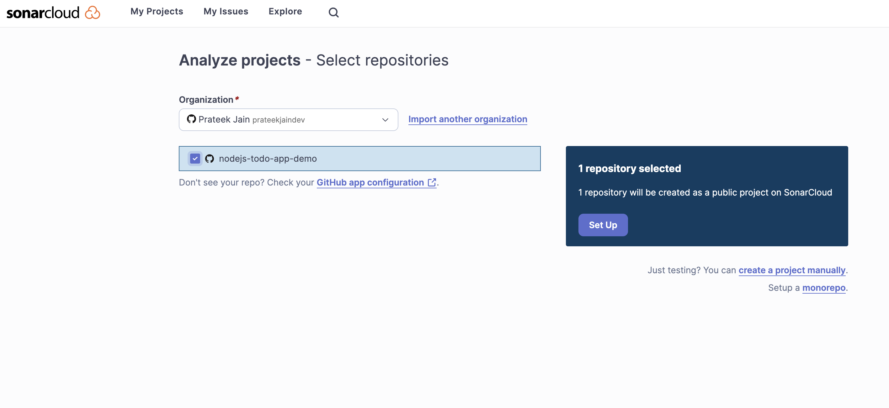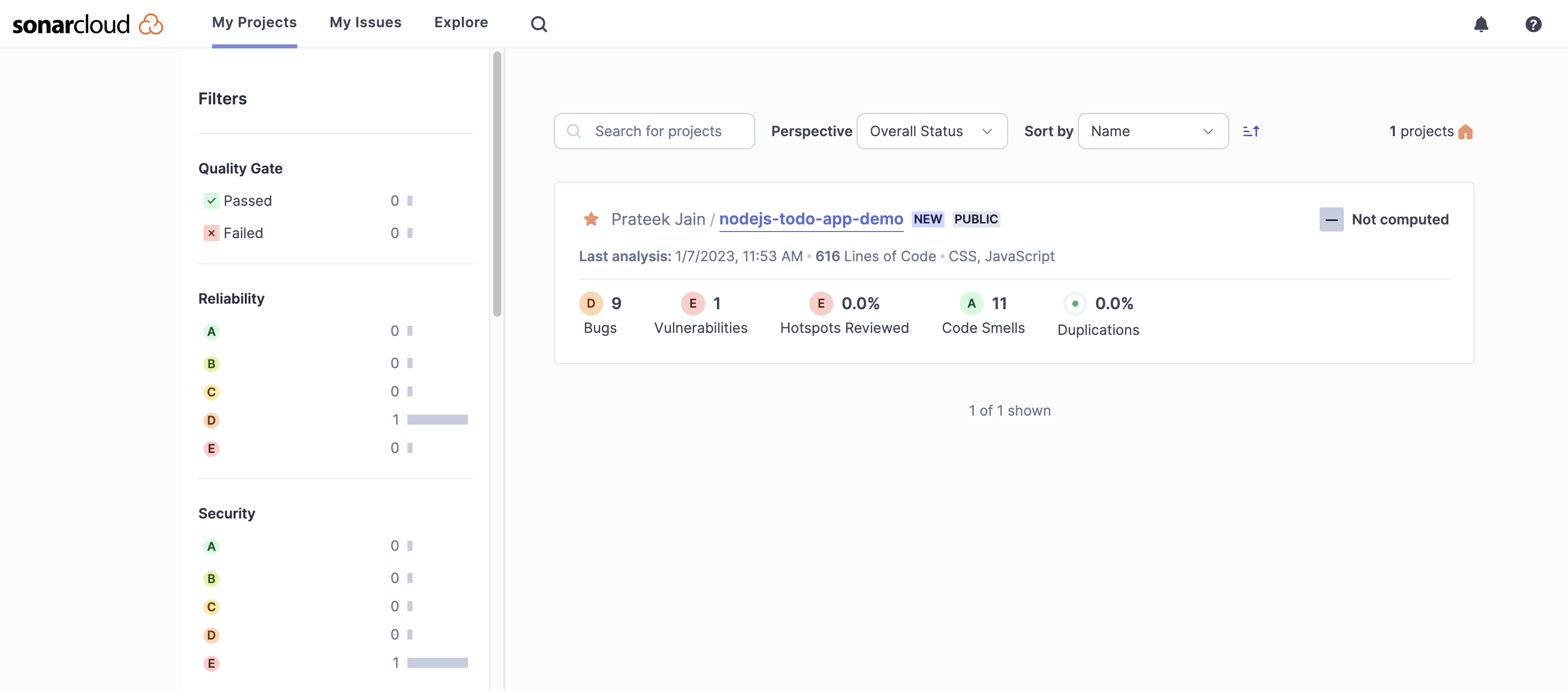 - Bây giờ trên bảng điều khiển SonarCloud, bạn có thể thấy dự án.