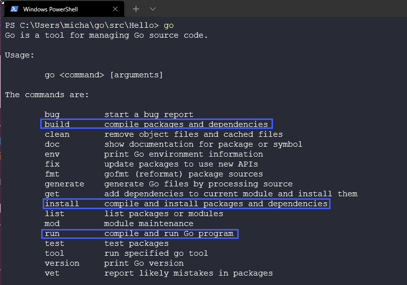 go run- Lệnh này biên dịch và chạy gói chính bao gồm các tệp .go được chỉ định trên dòng lệnh. Các file biên dịch được lưu trữ trong một thư mục tạm thời.go build- Để biên dịch các gói và phần phụ thuộc trong thư mục hiện tại. Nếu là góimain, sẽ đặt tệp thực thi trong thư mục hiện tại, nếu không, tệp thực thi sẽ được đặt trong thư mụcpkg.go buildcũng cho phép bạn tạo một tệp thực thi cho bất kỳ nền tảng, hệ điều hành được hỗ trợ bởi của Go.go install- Tương tự như go build nhưng sẽ đặt tệp thi hành vào thư mụcbin