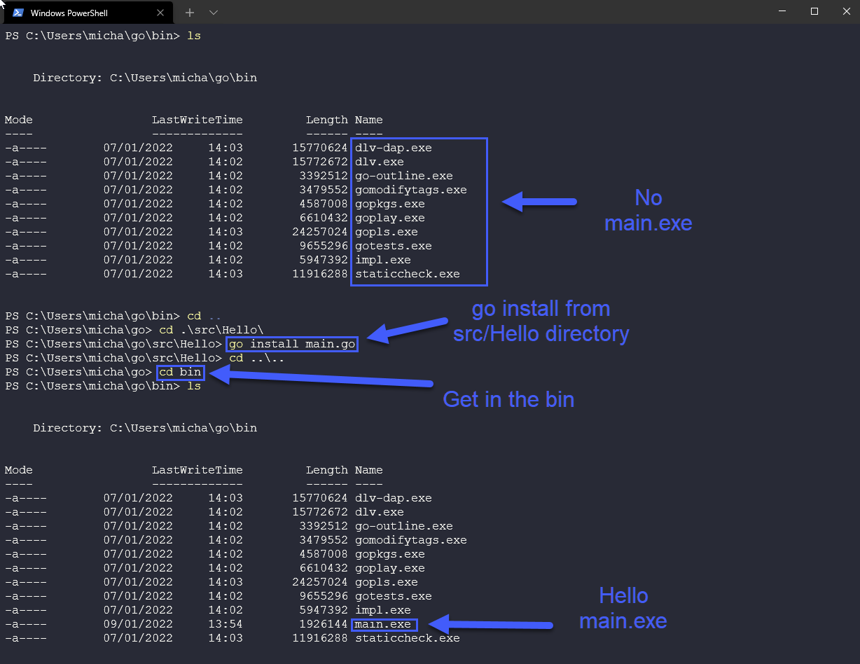Chúng ta đã sử dụng go build và go run nhưng hãy thử lại nếu bạn muốn, go install như đã trình bày ở trên, sẽ đặt tệp thực thi trong thư mục bin.