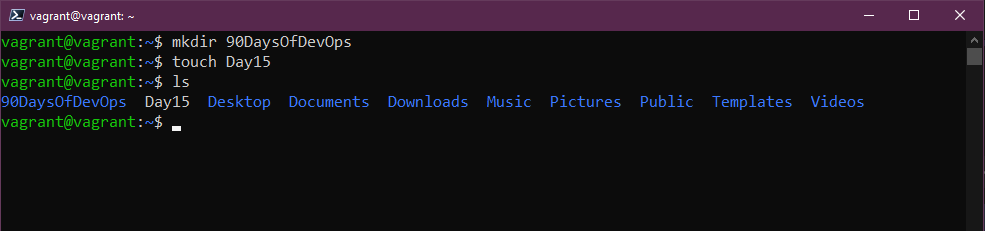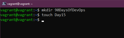Chúng ta đã biết cách tạo thư mục nhưng làm thế nào để có thể tạo một tệp? Chúng ta có thể tạo tệp bằng cách sử dụng lệnh touch. Nếu chúng ta dùng lệnh touch Day15, thao tác này sẽ tạo một tệp có tên là Day15. Bỏ qua mkdir, chúng ta sẽ gặp lại điều này sau.