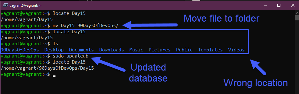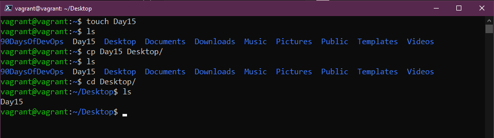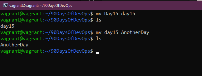 Còn việc di chuyển tệp từ vị trí này sang vị trí khác thì sao? Lệnh mv sẽ cho phép bạn di chuyển các tệp của mình. Ví dụ mv Day15 90DaysOfDevOps sẽ di chuyển tệp của bạn vào thư mục 90DaysOfDevOps.