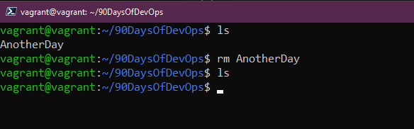 Đủ rồi, bây giờ hãy loại bỏ (xóa) tệp và thậm chí có thể là thư mục mà chúng ta đã tạo. Hãy dùng lệnh rm, chỉ cần rm AnotherDay sẽ xóa tệp AnotherDay trong thư mục hiện tại. Chúng ta cũng sẽ sử dụng khá nhiều rm -R sẽ chạy và sử dụng đệ quy thông qua một thư mục hoặc vị trí. Chúng ta cũng có thể sử dụng rm -R -f để xóa tất cả các tệp đó một cách bắt buộc (force). Spoiler nếu bạn chạy rm -R -f / và thêm sudo vào, bạn có thể nói lời tạm biệt với hệ thống của mình....!