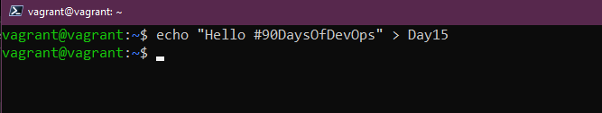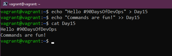 Chúng ta đã tạo các thư mục và tệp nhưng chưa đặt thêm bất cứ nội dung nào vào thư mục của mình, chúng ta có thể thêm nội dung theo một số cách nhưng một cách dễ dàng là echo. Chúng ta cũng có thể sử dụng echo để in ra nhiều thứ trong terminal của mình. Tôi sử dụng echo để in ra các biến hệ thống để biết liệu chúng có được cài đặt hay chưa. Chúng ta có thể sử dụng echo "Xin chào #90DaysOfDevOps" > Day15 và thao tác này sẽ thêm nó vào tệp của chúng ta. Chúng ta cũng có thể thêm vào tệp của mình bằng cách sử dụng echo "Commands are fun!" >> Day15
