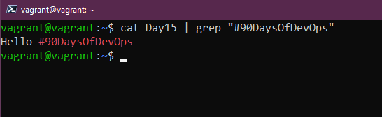 Nếu bạn có một tệp cấu hình phức tạp và bạn muốn hoặc cần tìm thứ gì đó trong tệp đó một cách nhanh hơn so với việc phải đọc từng dòng thì lệnh grep là bạn của bạn, nó cho phép chúng ta tìm kiếm tệp cho một từ cụ thể bằng cách sử dụng cat Day15 | grep "#90DaysOfDevOps"