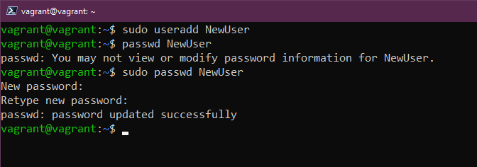 Chúng ta cũng có thể muốn thêm người dùng mới vào hệ thống của mình, có thể thực hiện việc này với useradd. Chúng ta phải thêm người dùng bằng lệnh sudo của mình, và có thể thêm người dùng mới bằng sudo useradd NewUser