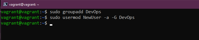 Tạo nhóm mới cũng yêu cầu sudo và chúng ta có thể sử dụng sudo groupadd DevOps nếu chúng ta muốn thêm người dùng mới của mình vào nhóm đó, việc này có thể được thực hiện bằng cách chạy sudo usermod -a -G DevOps -a là add (thêm vào) và -G là tên nhóm.