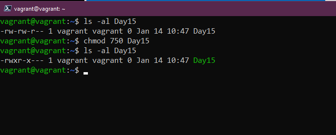 Chúng ta có thể thay đổi điều này bằng cách sử dụng chmod, bạn có thể thấy sẽ điều này khi tạo nhiều tệp nhị phân trên hệ thống của mình và cần cung cấp quyền thực thi cho các tệp nhị phân đó. chmod 750 Day15 và bây giờ chạy lệnh ls -al Day15. Nếu bạn muốn chạy lệnh này cho toàn bộ thư mục thì sử dụng -R để làm điều đó một cách đệ quy.