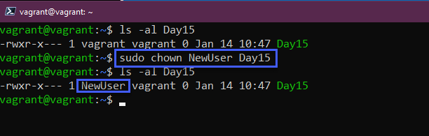 Vậy còn nếu muốn thay đổi chủ của tập tin? Chúng ta có thể sử dụng chown cho thao tác này, nếu muốn thay đổi quyền sở hữu của Day15 từ người dùng vagrant thành NewUser, chúng ta có thể chạy lệnh sudo chown NewUser Day15 và một lần nữa -R có thể sử dụng để làm điều này một cách đệ quy.