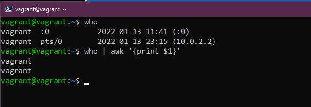 Một lệnh mà bạn sẽ có thể sẽ gặp nhiều là awk. Lệnh này được sử dụng trong thực tế khi bạn chỉ cần dữ liệu cụ thể từ một đầu ra. Giống như chạy lệnh who chúng ta sẽ nhận được các dòng có thông tin, nhưng nếu chỉ cần tên người dùng, chúng ta có thể chạy who | awk '{print $1}' để chỉ lấy của cột đầu tiên của danh sách đó.