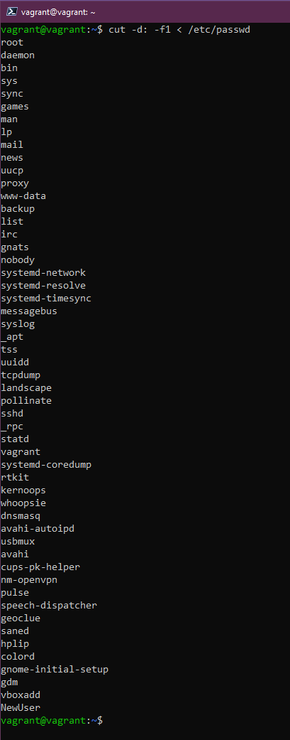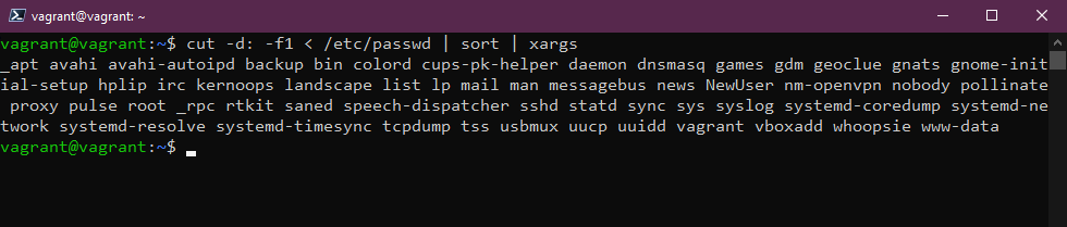 Nếu bạn đang muốn đọc các luồng dữ liệu từ đầu vào tiêu chuẩn (stdin - standard input), thì hãy tạo và thực thi các dòng lệnh; nghĩa là nó có thể lấy đầu ra của một lệnh và dùng nó làm đối số của một lệnh khác. xargs là một công cụ hữu ích cho trường hợp sử dụng này. Ví dụ: nếu tôi muốn có danh sách tất cả tài khoản người dùng Linux trên hệ thống, tôi có thể chạy cut -d: -f1 < /etc/passwd và lấy danh sách dài như bạn thấy bên dưới.