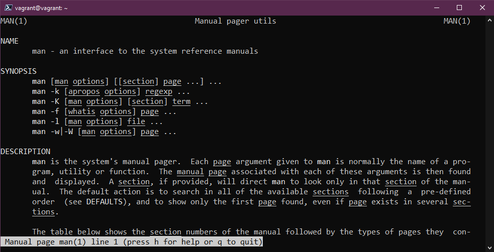 Tôi không thể trình bày tất cả các lệnh trong bài viết này, có nhiều trang và tài liệu đề cập đến những điều này nhưng nếu bạn đang ở terminal của mình và muốn tìm hiểu các tùy chọn cho một lệnh cụ thể, chúng ta có trang man viết tắt cho manual (hướng dẫn sử dụng). Sử dụng câu lệnh này để xem qua từng lệnh mà chúng ta đề cập trong bài này để biết thêm các tùy chọn cho từng lệnh. Chúng ta có thể chạy man man để được trợ giúp cho các chính cách trang hướng dẫn. Nhập q để thoát khỏi các trang đó.