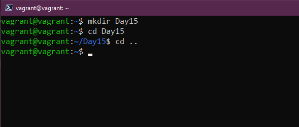 Với cd, chúng ta có thể thay đổi thư mục. Để di chuyển vào thư mục mới tạo của mình, chúng ta có thể thực hiện việc này với lệnh cd Day15 cũng có thể sử dụng tab để tự động hoàn thành câu lệnh với thư mục có sẵn. Chúng ta có thể quay lại vị trí lúc mới bắt đầu bằng câu lệnh cd. .