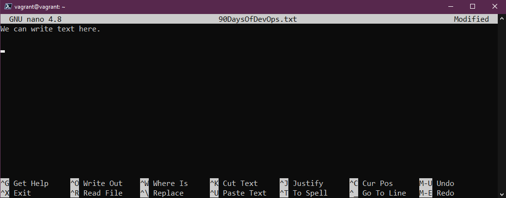 Nếu bạn chạy nano 90DaysOfDevOps.txt, chúng ta sẽ có một tệp mới không có gì trong đó, từ đây chúng ta có thể thêm văn bản của mình và hướng dẫn bên dưới là những gì chúng ta muốn thay đổi tệp đó.