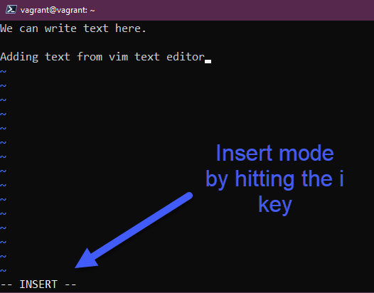 Bạn bắt đầu ở chế độ normal, có các chế độ command, normal, visual, insert, nếu muốn thêm văn bản, chúng ta sẽ cần chuyển từ normal sang insert bằng phím i, nếu bạn đã thêm/sửa văn bản và muốn lưu lại những thay đổi này, nhấm escape và sau đó là :wq
