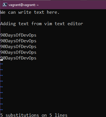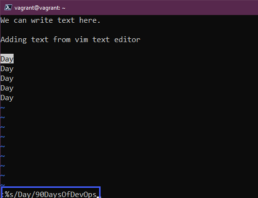 Bây giờ chúng ta muốn thay thế từ đó bằng 90DaysOfDevOps, có thể thực hiện việc này bằng cách nhấn ESC và nhập :%s/Day/90DaysOfDevOps