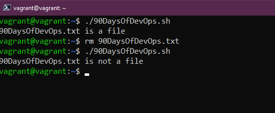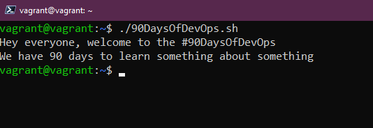 Bây giờ chúng ta có thể chạy lại tập lệnh của mình bằng cách sử dụng ./90DaysOfDevOps.sh. Sau khi chạy, tập lệnh hiện đã tạo một thư mục mới, thay thư mục hiện tại thành thư mục đó đó và cuối cùng tạo một tệp mới.