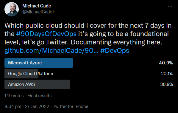 Trước khi chúng ta bắt đầu, nhà cung cấp chiến thắng trong cuộc thăm dò trên twitter là Microsoft Azure, do đó, nó sẽ là chủ đề xuyên suốt tuần này. Kết quả rất gần nhau và rất vui khi thấy nó chỉ trong 24 giờ.