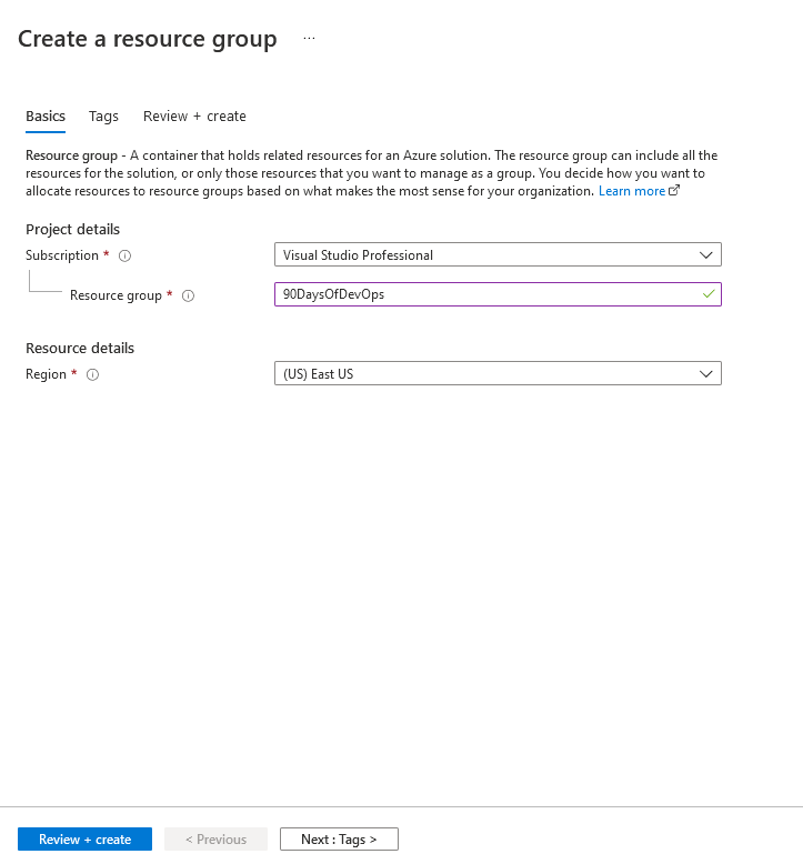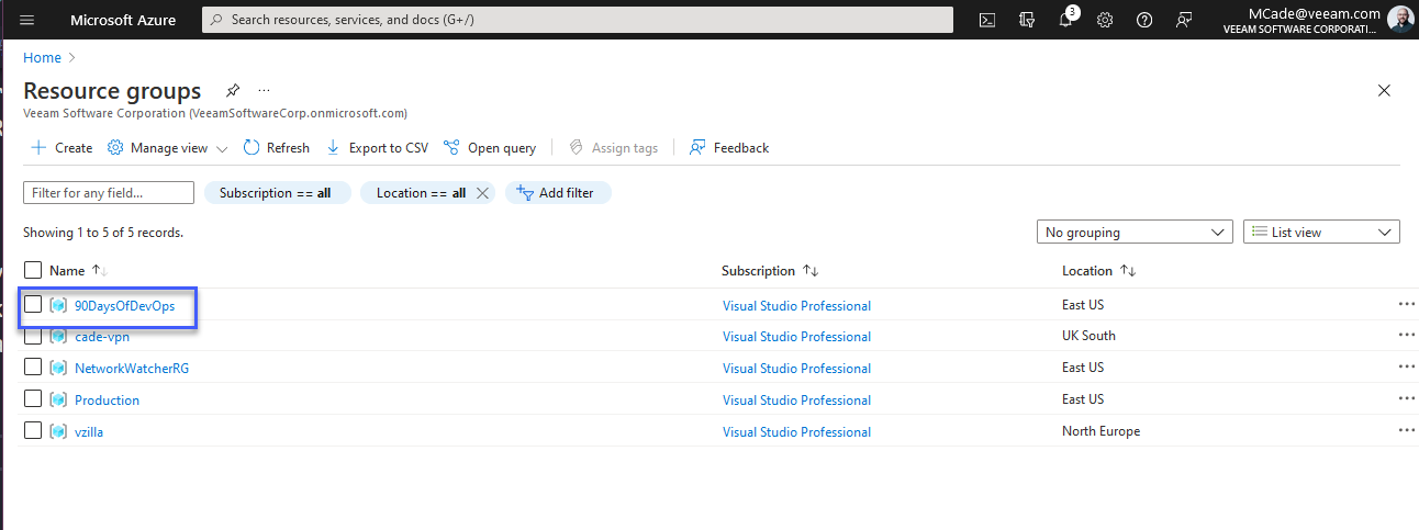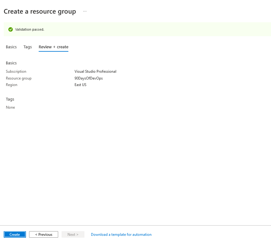 Nhấn "create", sau đó trong danh sách resource groups của chúng ta đã có nhóm "90DaysOfDevOps" sẵn sàng cho những buổi tiếp theo.