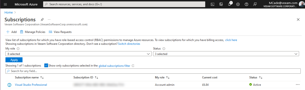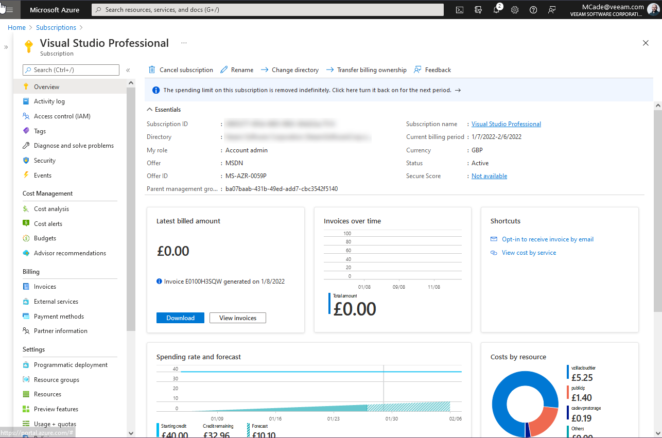 Trước tiên, chúng ta hãy xem subscription của mình, bạn sẽ thấy ở đây rằng tôi đang sử dụng đăng ký Visual Studio Professional của mình để lấy một khoản tín dụng miễn phí hàng tháng.