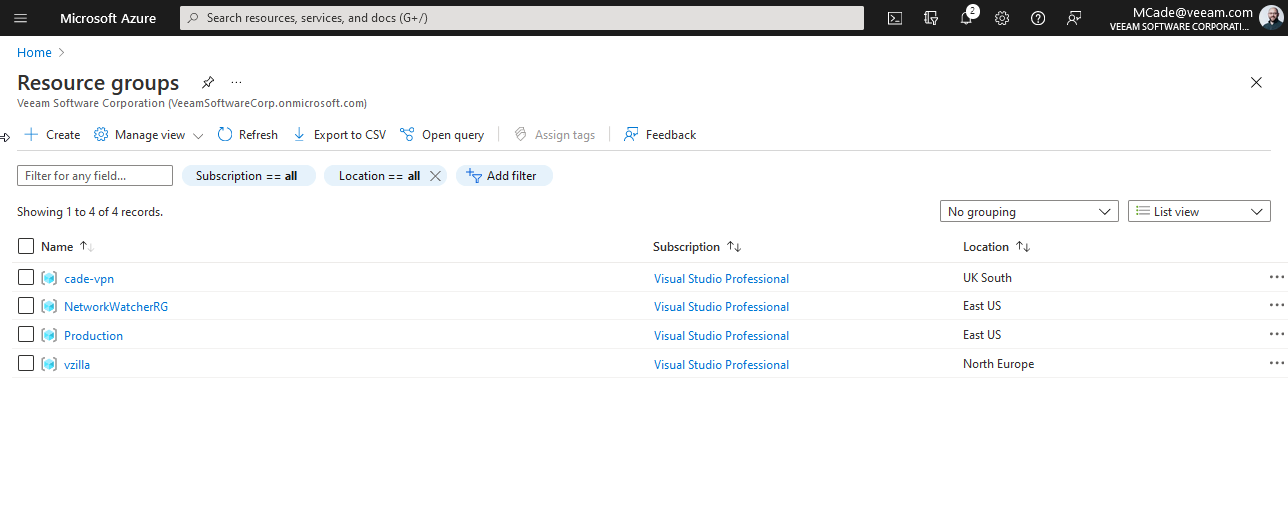 Tiếp theo, chúng ta có resource group, đây là nơi chúng ta kết hợp các tài nguyên của mình và có thể dễ dành quản lý chúng ở một nơi duy nhất. Tôi có một số resource groups được tạo cho một vài dự án khác.