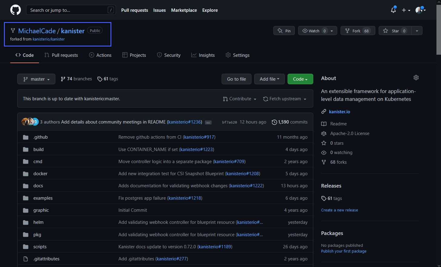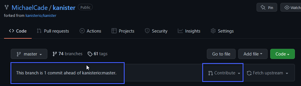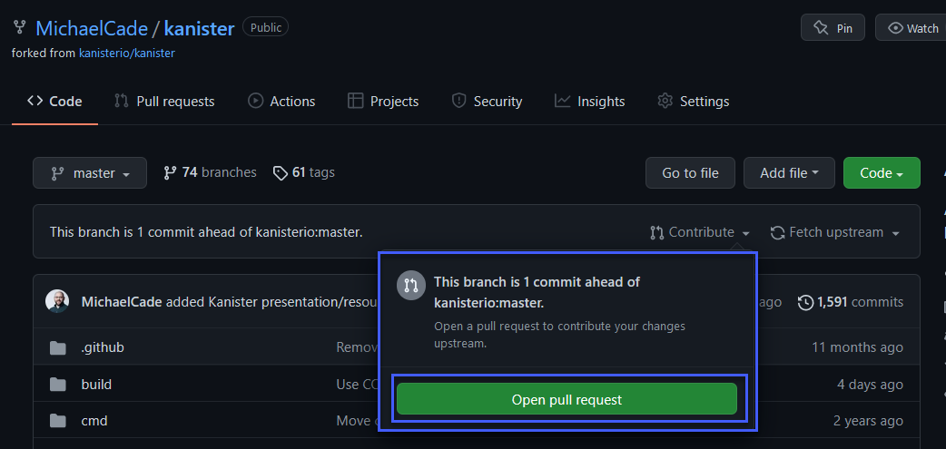 Bây giờ chúng ta có thể quay trở lại kho lưu trữ được forked của Kanistẻ và thấy rằng mình đang ở trước một commit so với nhánh kanisterio:master.