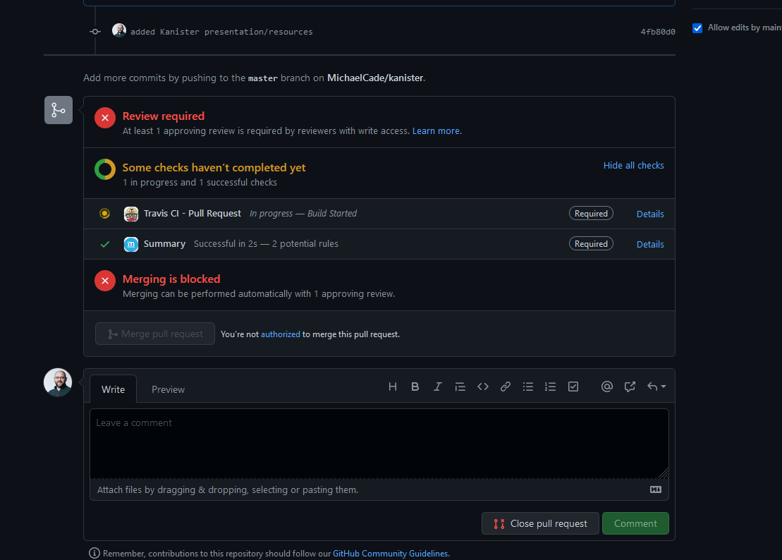 Kéo xuống dưới, bạn có thể thấy một số quá trình tự động hoá đang diễn ra, trong trường hợp này, chúng ta yêu cầu một review cho pull request của mình. Chúng ta có thể thấy Travis CI đang được tiên shanfh và quá trình build đã được bắt đầu và nó sẽ kiểm tra bản cập nhật của chúng ta, đảm bảo bổ sung mới không phá vỡ bất cứ điều gì.