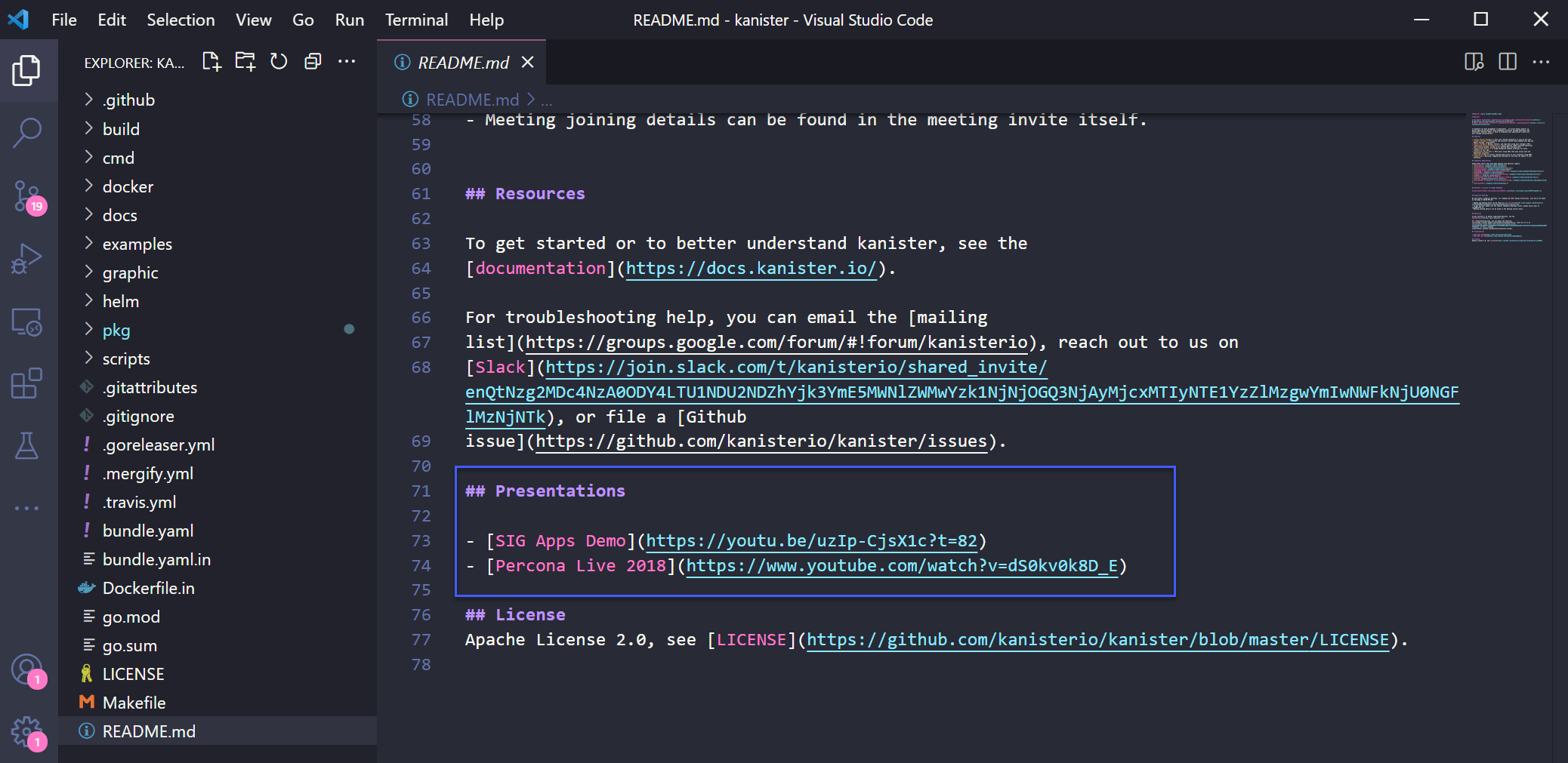 Điều đầu tiên chúng ta phải làm là tìm một dự án mà chúng ta có thể đóng góp. Gần đây, tôi đã thuyết trình về dự án Kanister Project và tôi muốn chia sẻ các bài thuyết trình của mình đã được đăng tải trên Youtube tới tệp Readme.md trong project đó.