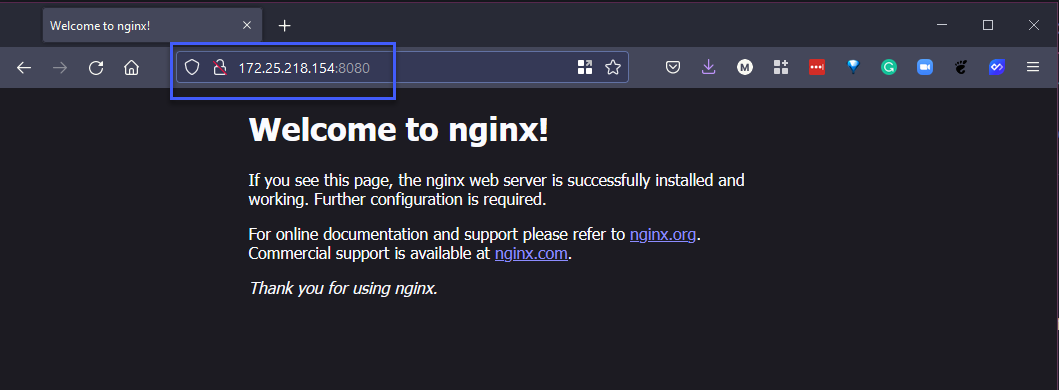 Sau đó, chúng ta có thể lấy IP này, mở trình duyệt và truy cập http://172.25.218.154:8080/ IP của bạn có thể khác. Điều này xác nhận rằng có thể truy cập được NGINX.