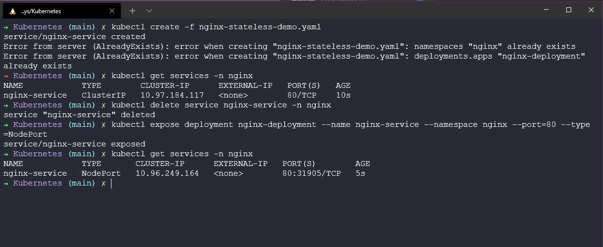 Trước hết, chúng ta xoá service của mình bằng cách sử dụng kubectl delete service nginx-service -n nginx