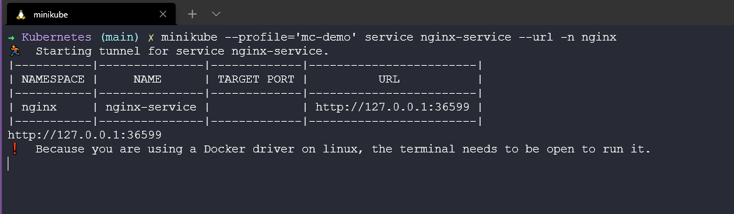 minikube --profile='mc-demo' service nginx-service --URL -n nginx