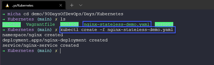 Chúng ta cần điều hướng tới vị trị tệp YAML của mình và chạy lệnh kubectl create -f nginx-stateless-demo.yaml, sau đó bạn có thể thấy 3 đối tượng đã được tạo và chúng ta có một namespace, deployment và service.