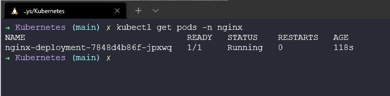Sau đó, nếu chúng ta kiểm tra các pods cho namespace sử dụng lệnh kubectl get pods -n nginx bạn sẽ thấy rằng chúng ta có 1 pod sẵn sàng và đang trong trạng thái chạy.