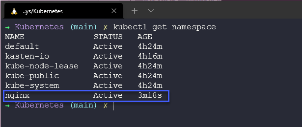 Trước khi chúng ta triển khai bất cứ thứ gì, chúng ta chỉ cần đảm bảo rằng chúng ta không có một namespace nào là nginx. Có thể xác nhận việc này bằng cách chạy lệnh kubectl get namespace và như bạn có thể thấy dưới đây, chúng ta không có namespace nào là nginx.