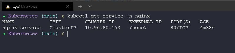 Chúng ta cũng có thể kiểm tra service đã được tạo bằng câu lệnh kubectl get service -n nginx