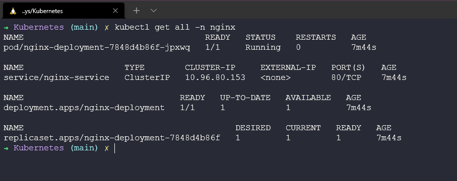 Ở trên có vài lệnh chúng ta cần biết nhưng cũng có thể sử dụng lệnh kubectl get all -n nginx để xem mọi thứ chúng ta đã triển khai với tệp YAML đó.