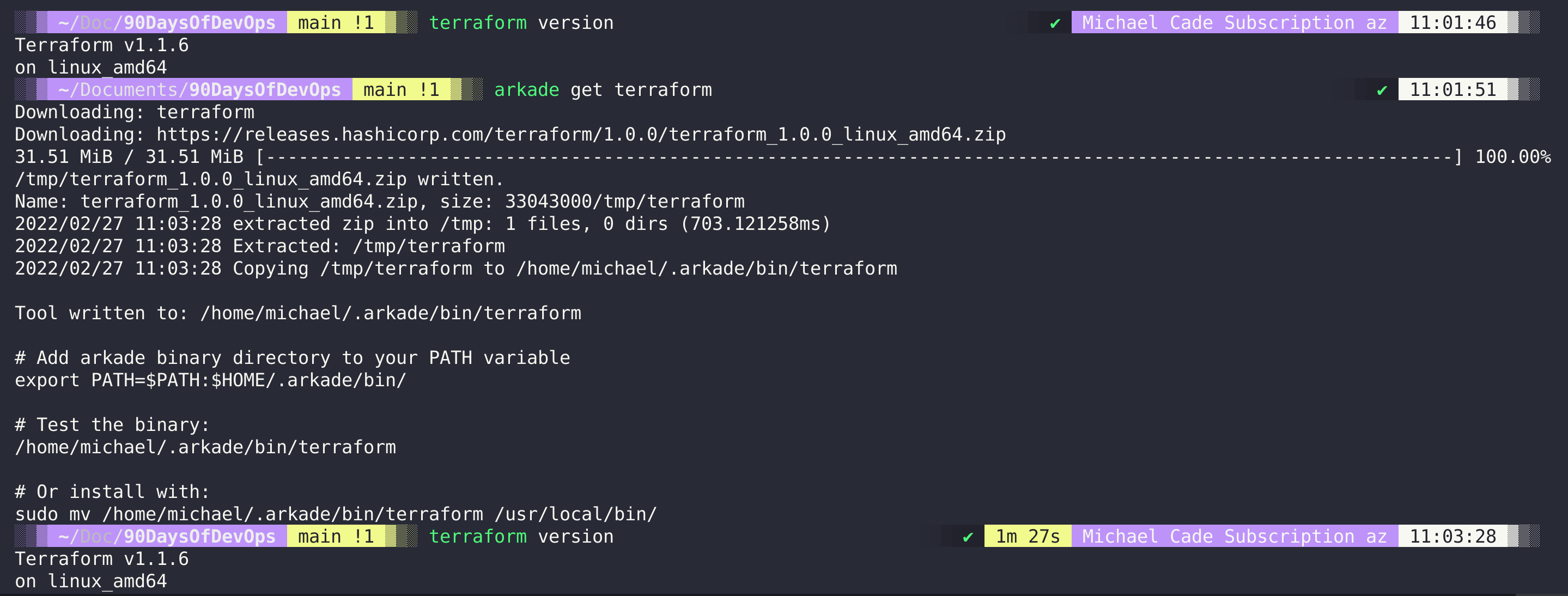 Sử dụng arkade để cài đặt Terraform, arkade là một công cụ nhỏ, tiện dụng để cài đặt các công cụ, ứng dụng và clis cần thiết vào hệ thống của bạn. Một câu lệnh arkade get terraform đơn giản sẽ cho phép cập nhật terraform nếu có hoặc cũng cài đặt Terraform CLI.