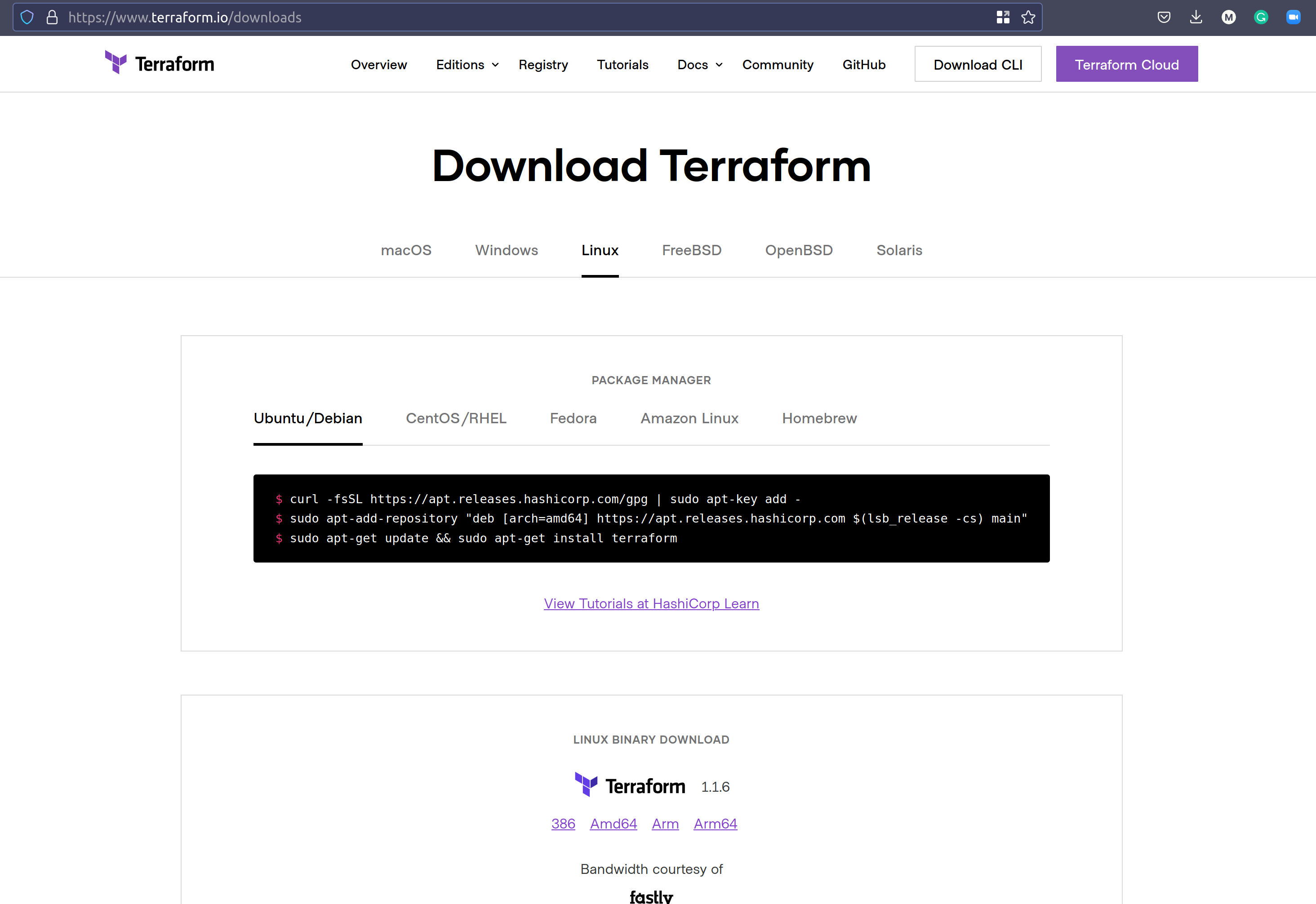Terraform hỗ trợ đa nền tảng và bạn có thể thấy bên dưới trên máy tính Linux của tối, chúng ta có một số tuỳ chọn để tải xuống và cài đặt CLI