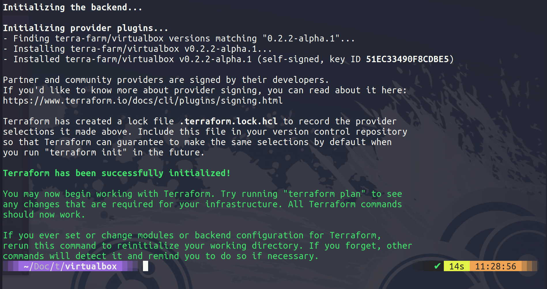 Bây giờ sau khi chúng ta đã định nghĩa mã của mình, chúng ta có thể thực hiện lệnh terraform init trên thư mục của chúng ta để tải xuống nhà cung cấp cho Virtualbox.