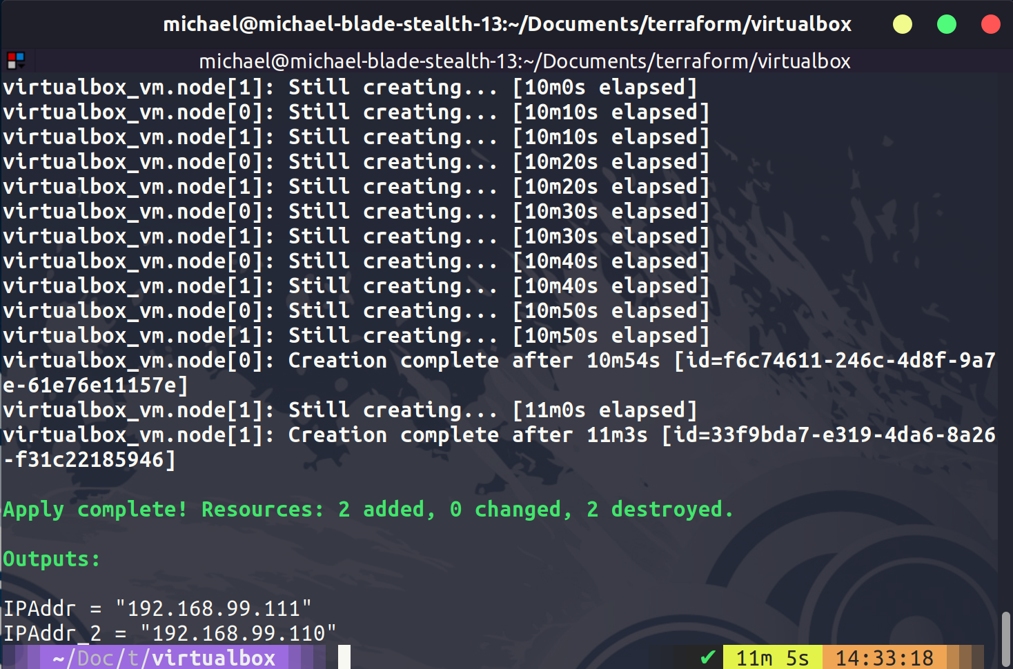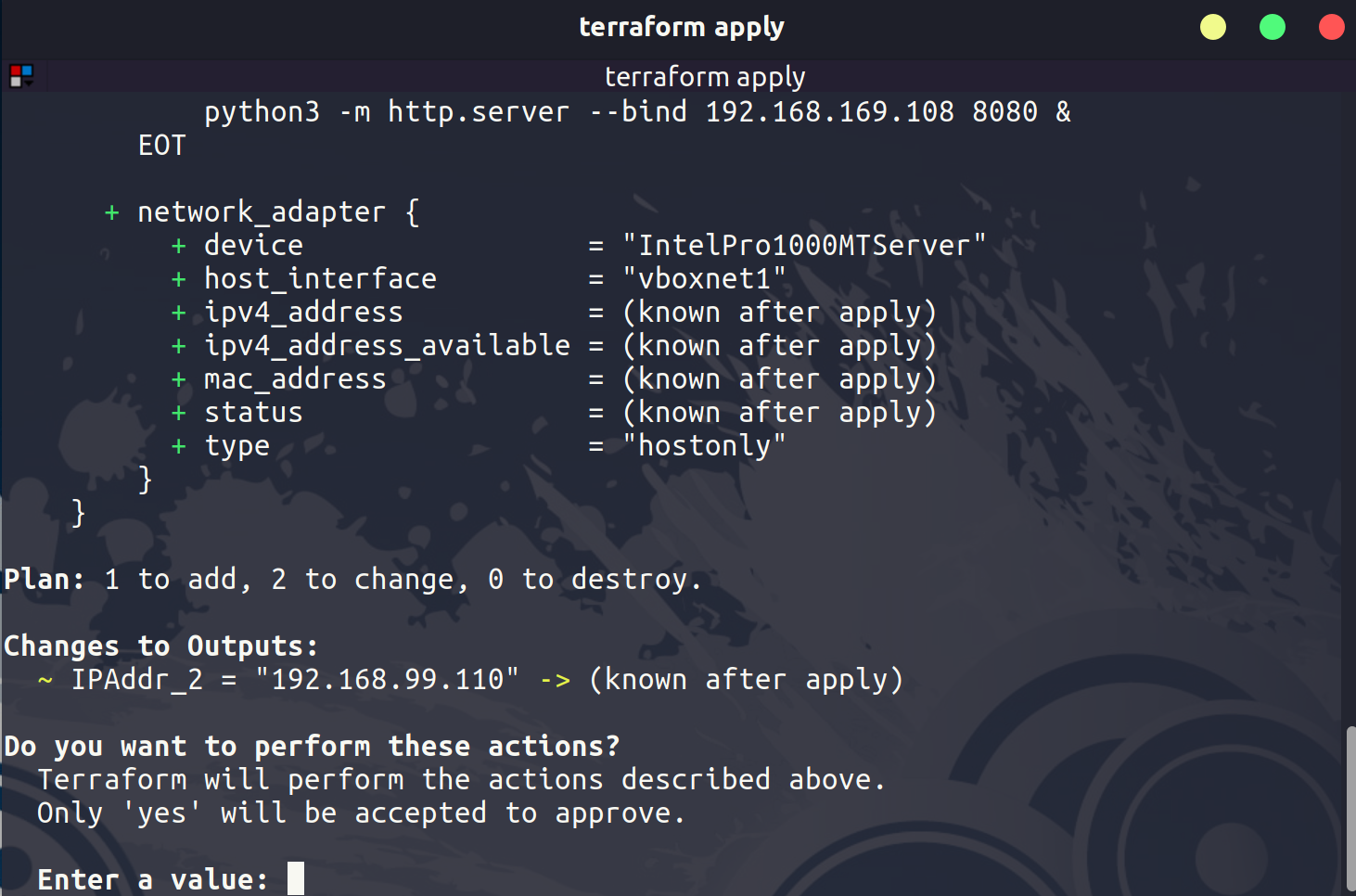 Bạn cũng cần phải cài đặt VirtualBox trên hệ thống của bạn. Sau đó, chúng ta có thể chạy lệnh terraform plan để xem mã của chúng ta sẽ tạo ra gì cho chúng ta. Tiếp theo là terraform apply. Hình ảnh dưới đây hiển thị quá trình hoàn thành của bạn.