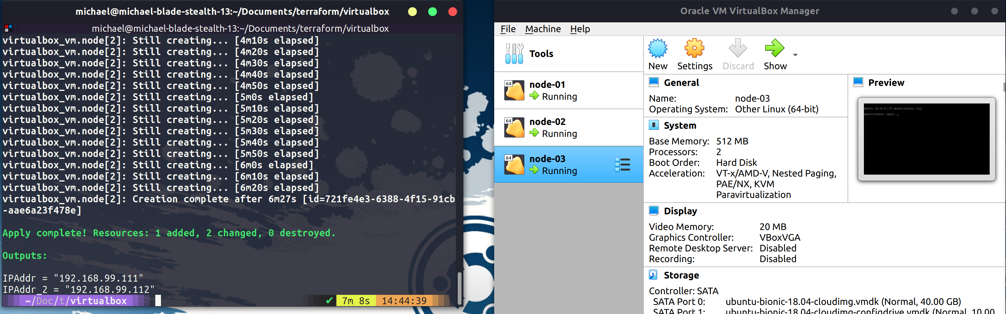 Trong bài này, chúng ta sẽ tạo một hoặc hai máy ảo bằng cách sử dụng terraform trong VirtualBox. Điều này không phải là một trường hợp thông thường, VirtualBox là một lựa chọn ảo hóa máy trạm và điều này không phải là một trường hợp sử dụng cho Terraform, nhưng hiện tại tôi đang ở độ cao 36.000ft và dù tôi đã triển khai các tài nguyên trên public cloud, nhưng việc làm điều này trên máy tính xách tay của tôi nhanh hơn nhiều.
