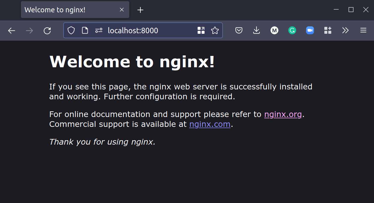 Nếu chúng ta mở trình duyệt và điều hướng đến http://localhost:8000/, bạn sẽ thấy chúng ta có quyền truy cập vào container NGINX của chúng ta.