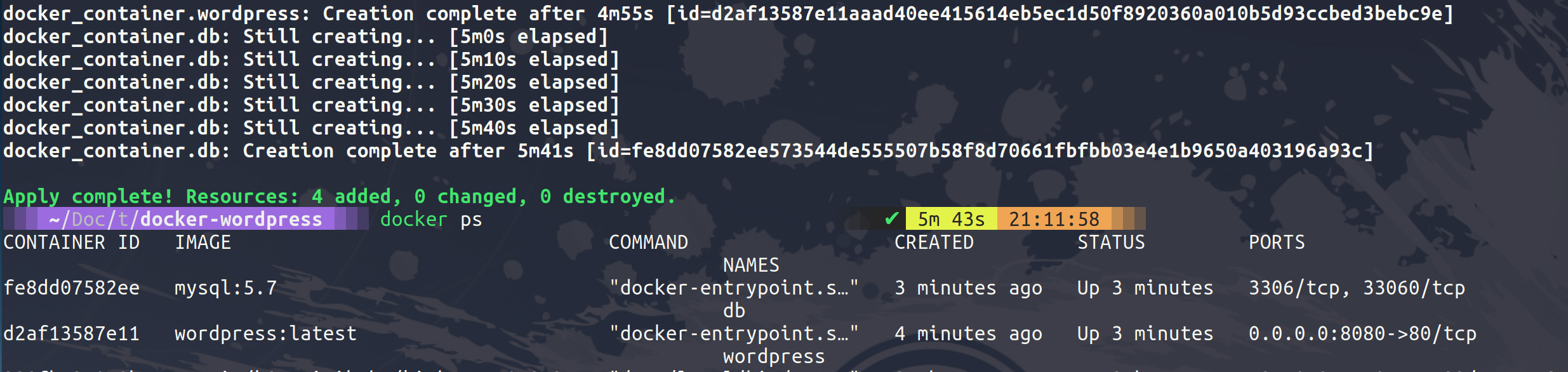 Sau đó, chúng ta chạy lệnh terraform apply và kiểm tra đầu ra của lệnh docker ps, chúng ta sẽ thấy các container mới được tạo ra.