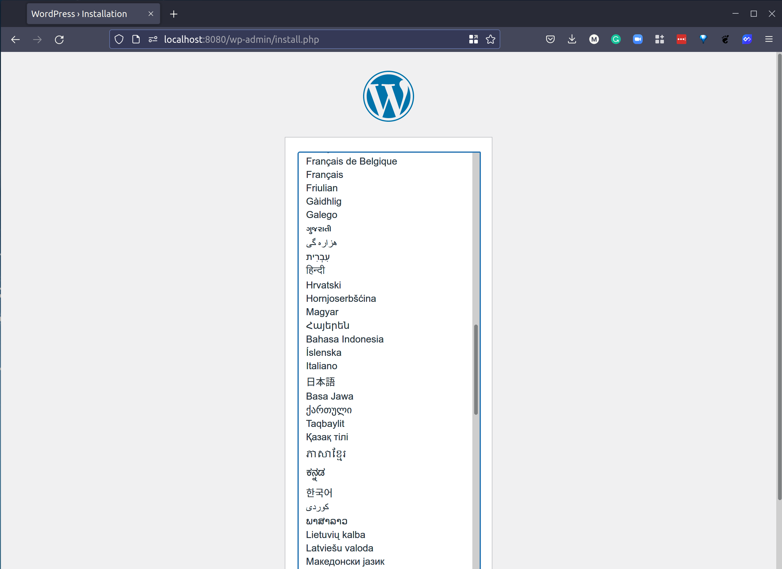 Sau đó, chúng ta có thể truy cập vào giao diện WordPress. Tương tự như khi chúng ta đã thực hiện quá trình này với docker-compose trong phần container, bây giờ chúng ta có thể tiếp tục thiết lập và các bài viết WordPress của chúng ta sẽ được lưu trong cơ sở dữ liệu MySQL.