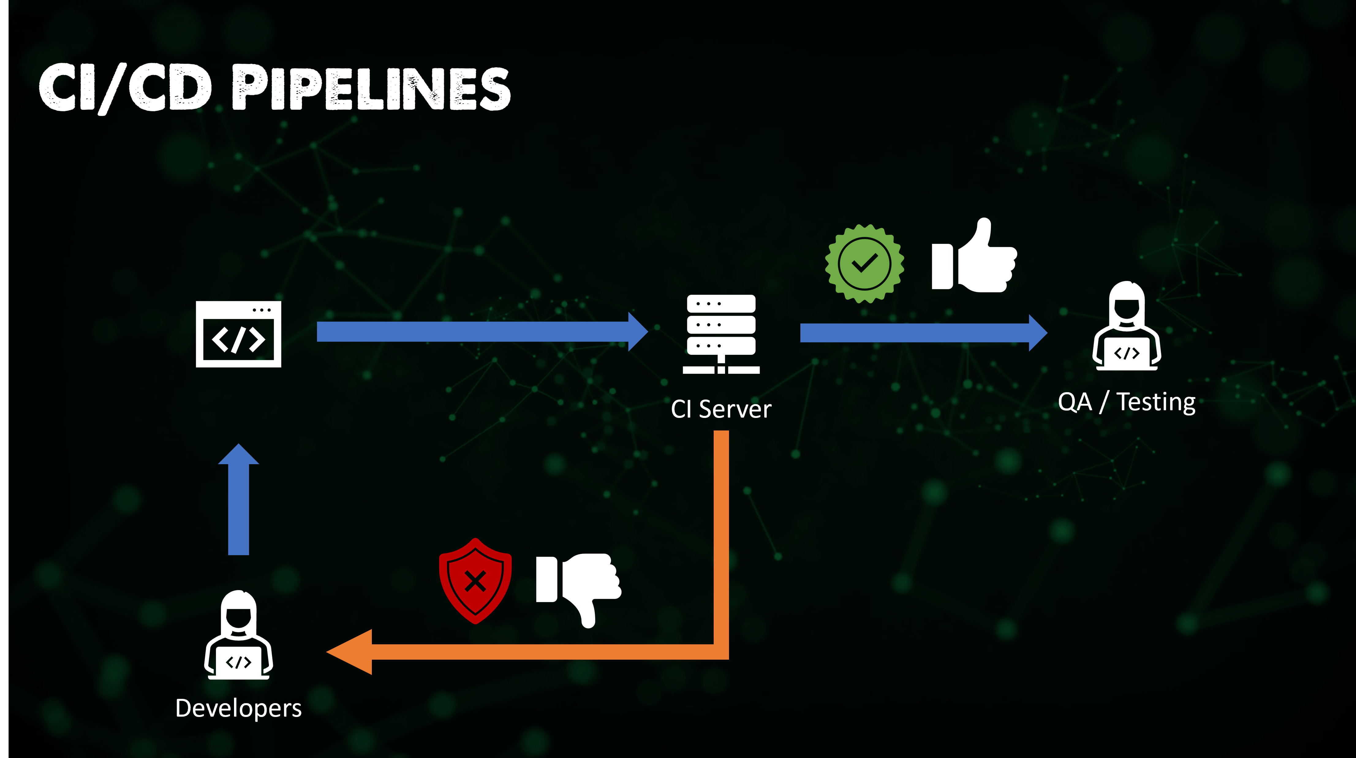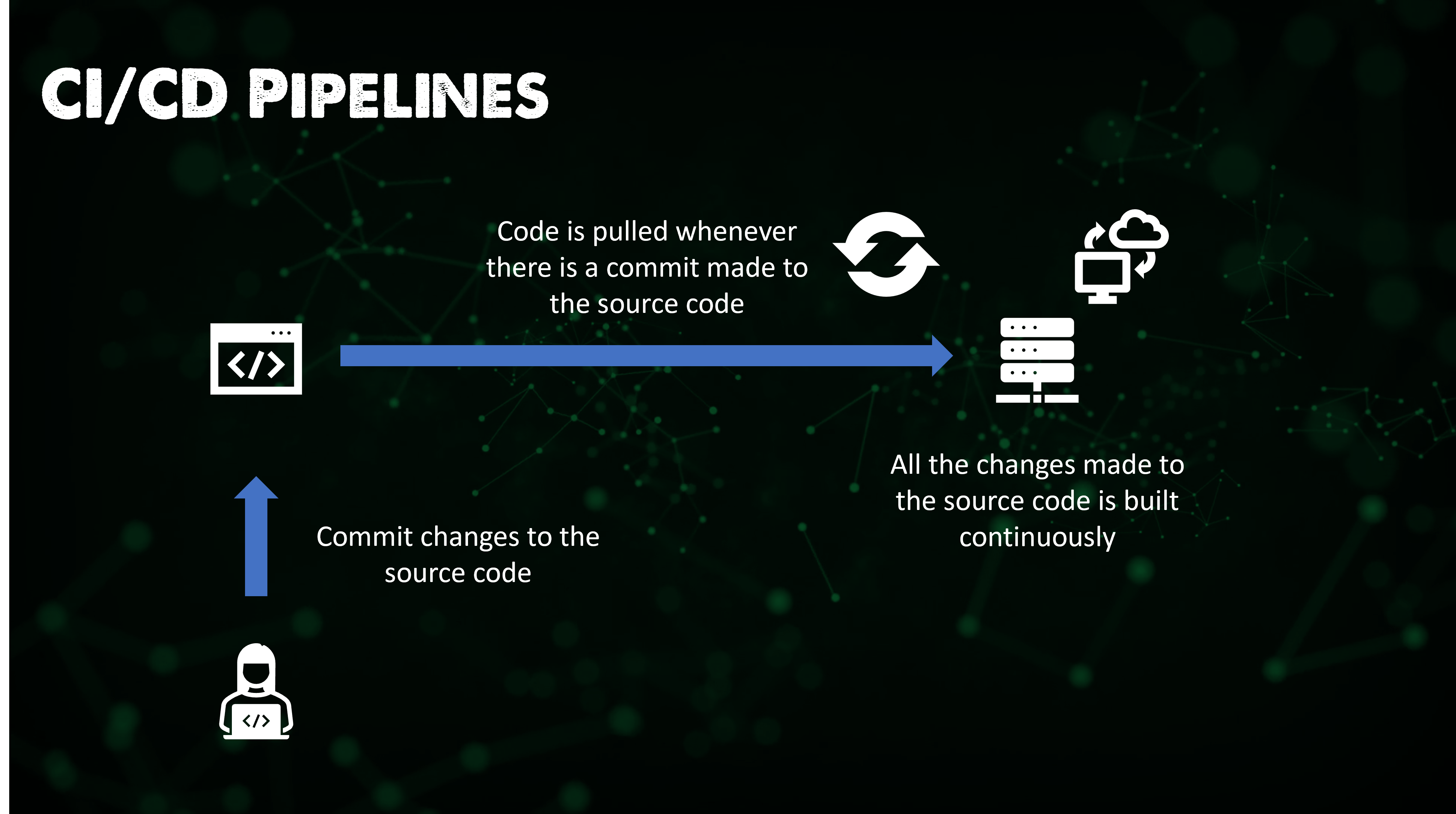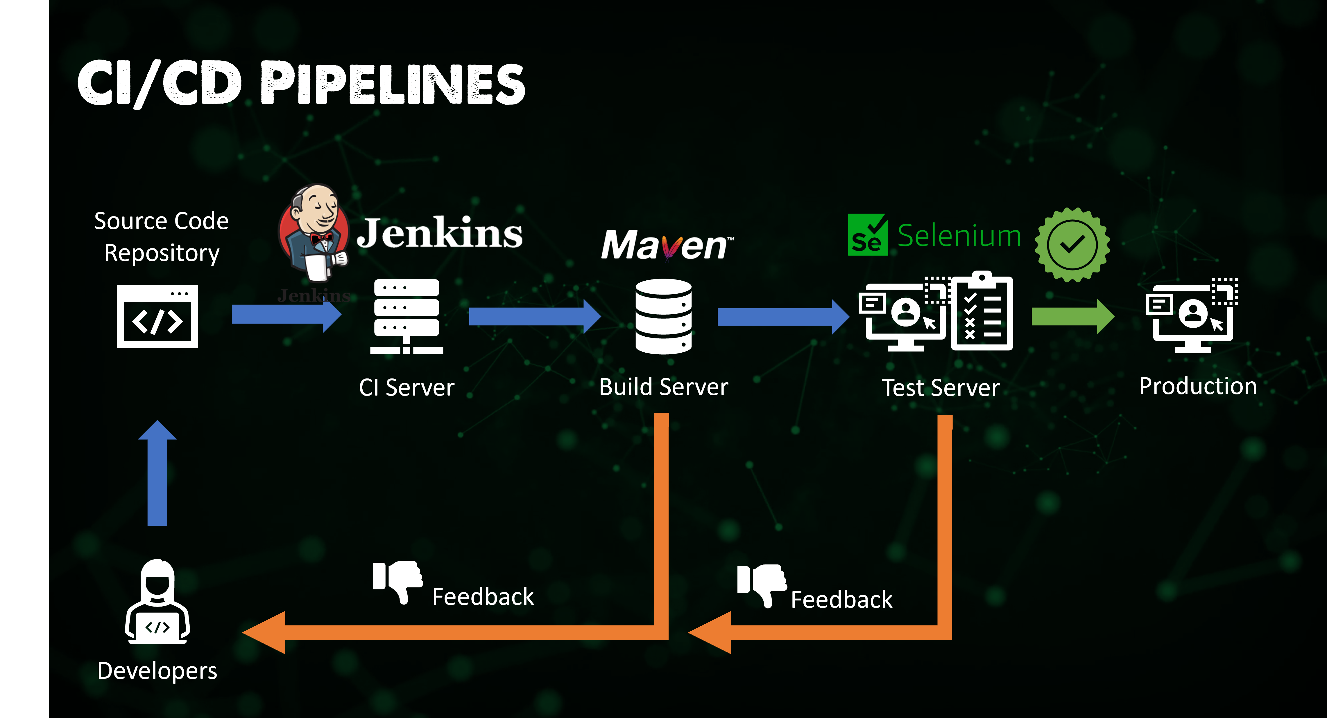 Bạn commit mã nguồn tới Jenkins, nơi sau đó sẽ xây dựng ứng dụng của bạn, với tất cả bài kiểm thử tự động, nó sẽ phát hành và triển khai mã nguồn đó khi mỗi bước được hoàn thành. Jenkins sẽ tự động hoá quá trình này.