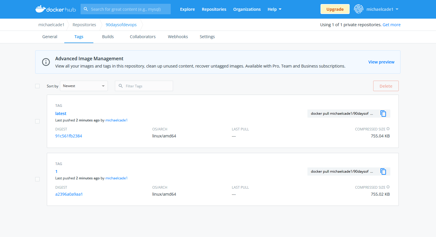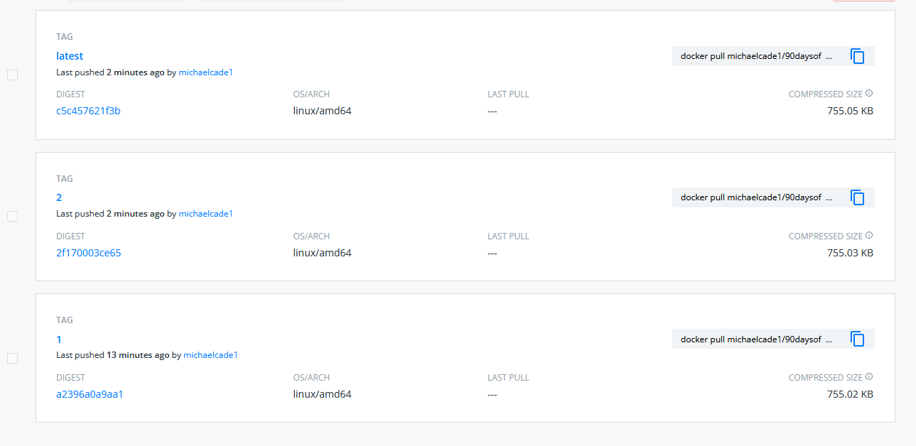 Nếu chúng ta sau đó đi đến kho DockerHub của mình, chúng ta sẽ thấy có 2 Docker images mới. Chúng ta nên có một Build ID là 1 và latest vì đối với mỗi lần xây dựng mà chúng ta tạo dựa trên "Upload to DockerHub" chúng ta gửi một phiên bản bằng biến môi trường Jenkins Build_ID và chúng ta cũng phát hành một phiên bản "latest".