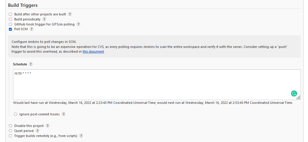 Điều này đáng để quan tâm vì nếu bạn đang sử dụng các tài nguyên đám mây mất phí để duy trì pipeline và bạn có nhiều thay đổi tới kho lưu trữ mã nguồn bạn sẽ chịu phát sinh nhiều chi phí. Chúng ta biết rằng đây chỉ là một môi trường chạy thử đó là lí do tôi đang sử dụng lựa chọn "poll scm". (Ngoài ra, tôi tin rằng khi sử dụng minikube tôi sẽ thiếu đi chức năng webhook)