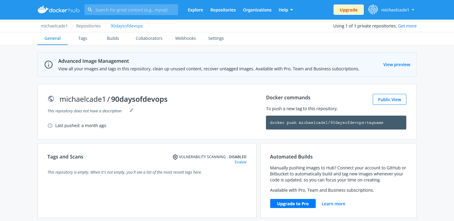Một thứ tôi đã thay đổi trong bài trước đó là tôi muốn tải ảnh tới một kho lưu trữ công cộng đó là michaelcade1\90DaysOfDevOps, Jenkinsfile của tôi đã có thay đổi này từ trước. Và từ bài trước, tôi đã gỡ toàn bộ các ảnh container demo.